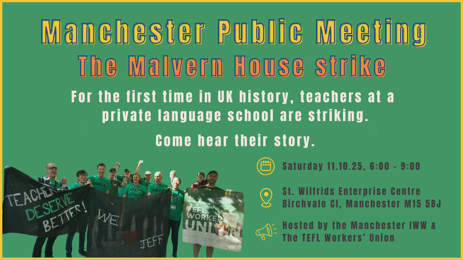 The TEFL Workers’ Union is proud to sponsor a public meeting on Saturday October 11th, to be held at the IWW office in Manchester. We’ll be joined by some of the Malvern House London teachers to hear their story of the first English language school strike in UK history! When: Saturday October 11 Where: St. … Read more